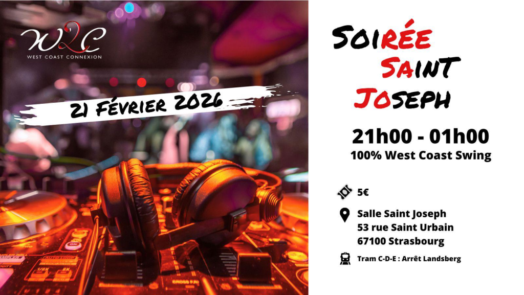 Le 21 février, nous vous invitons à une soirée dans une ambiance chaleureuse et dansante à la Salle St Joseph. Venez partager votre passion du West Coast Swing !